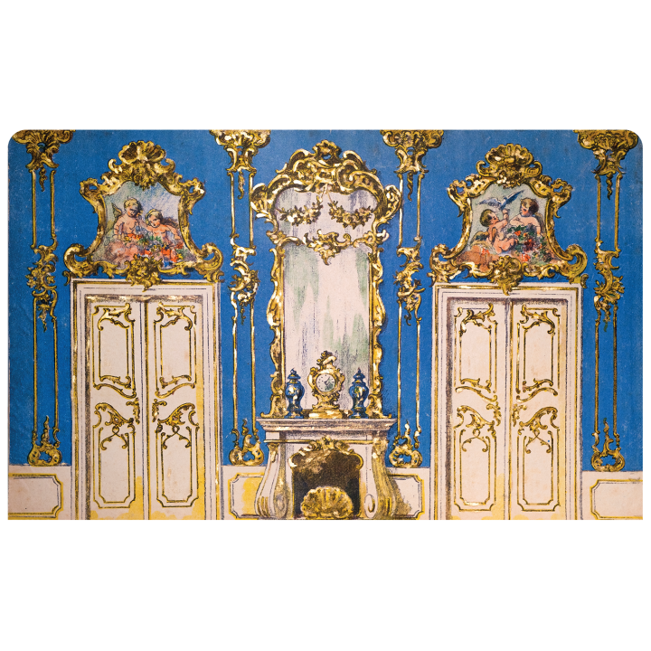 Obsahuje: Přední portál - ANTIK, podstavu (dřevěná krabice), 1 scénu (zámecká komnata), 4 kulisy - patřící k pozadí zámecké komnaty, scénář pohádky Šípková Růženak
