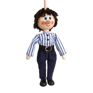 Jsem dřevěná loutka bez nití a ovládám se shora za pomocí tyče. Nejvíce se hodím pro malé děti.
