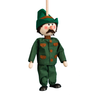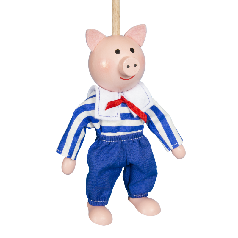 Jsem ručně vyráběná dřevěná loutka. Ovládám se snadno shora pomocí tyče a jsem bez nití. Jsem určená zejména pro malé děti.