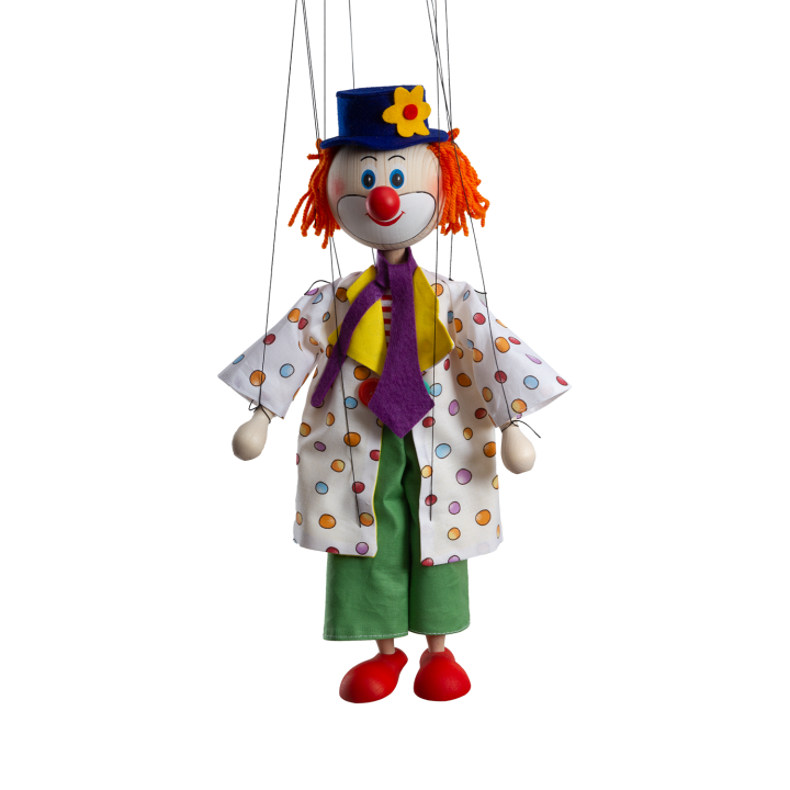 Dřevěná loutka o velikosti 35 cm s klasickým vahadlem na nitích.