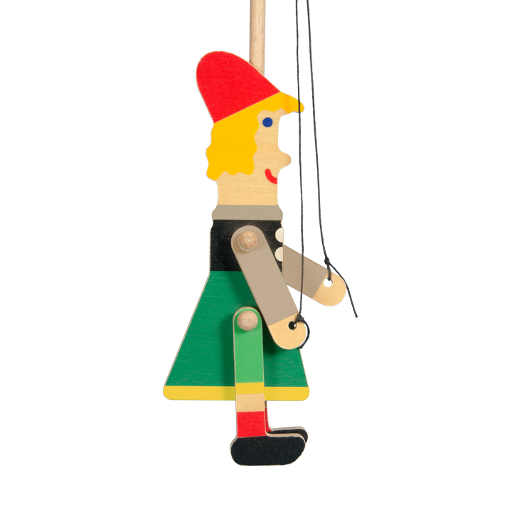 Jsem dřevěná loutka v nápaditém podání. Jsem konstruovaná velmi jednoduše – štíhlé tělo, tyč na držení a ovládání, ruce na dvou provázkách a pohyblivé nožičky. Díky lehkému ovládání  se mnou dokážou hrát nejkrásnější pohádky i ty nejmenší děti.