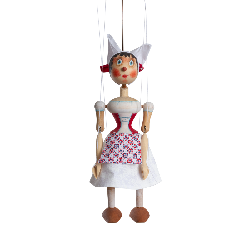 Jsem loutka vyrobená z voňavého dřeva, celá ručně malovaná. Ovládám se snadno. Shora pomocí vahadla se čtyřmi provázky. Zvládnou to všechny holčičky i kluci zhruba od tří let.