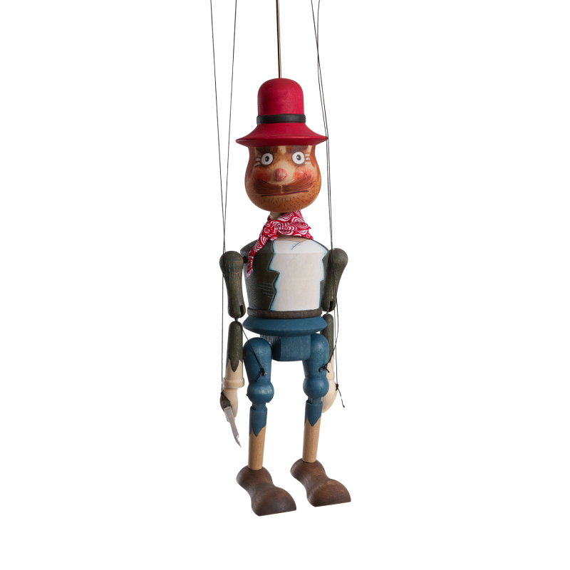Jsem loutka vyrobená z voňavého dřeva, celá ručně malovaná. Ovládám se snadno. Shora pomocí vahadla se čtyřmi provázky. Zvládnou to všechny holčičky i kluci zhruba od tří let.